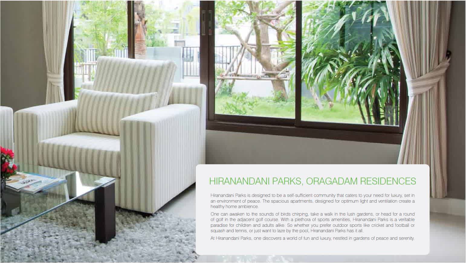 | HIRANANDANI PARKS, ORAGADAM RESIDENCES Hiranandani Parks is designed to be a self-sufficient community that caters to your need for luxury, set in an environment of peace. The spacious apartments, designed for optimum light and ventilation create a healthy home ambience. One can awaken to the sounds of birds chirping, take a walk in the lush gardens, or head for a round of golf in the adjacent golf course. With a plethora of sports amenities, Hiranandani Parks is a veritable paradise for children and adults alike. So whether you prefer outdoor sports like cricket and football or squash and tennis, or just want to laze by the pool, Hiranandani Parks has it all. At Hiranandani Parks, one discovers a world of fun and luxury, nestled in gardens of peace and serenity. | |