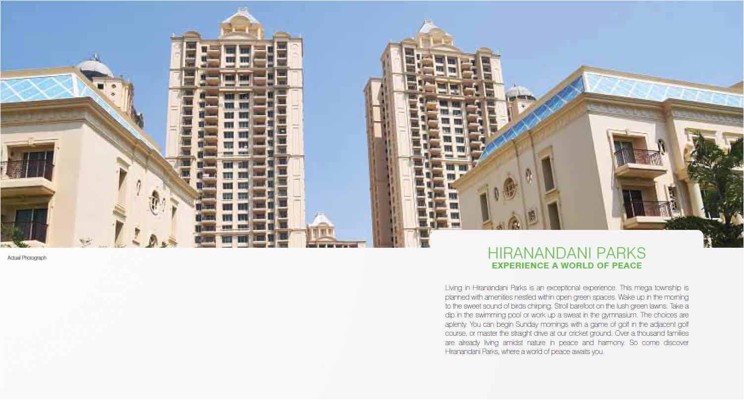 HIRANANDANI PARKS EXPERIENCE A WORLD OF PEACE Living in Hiranandani Parks is an exceptional experience. This mega township is planned with amenities nestled within open green spaces. Wake up in the morning to the sweet sound of birds chirping. Stroll barefoot on the lush green lawns. Take a dip in the swimming pool or work up a sweat in the gymnasium. The choices are aplenty. You can begin Sunday mornings with a game of golf in the adjacent golf course, or master the straight drive at our cricket ground. Over a thousand families are already living amidst nature in peace and harmony. So come discover Hiranandani Parks, where a world of peace awaits you. | |