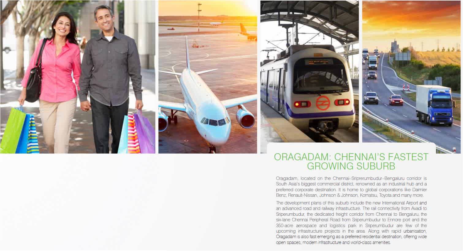 | ORAGADAM: CHENNAI’S FASTEST GROWING SUBURB Oragadam, located on the Chennai–Sriprerumbudur–Bengaluru corridor is South Asia’s biggest commercial district, renowned as an industrial hub and a preferred corporate destination. It is home to global corporations like Daimler Benz,Renault-Nissan,Johnson & Johnson, Komatsu,Toyota and many more.The development plans of this suburb include the new International Airport and an advanced road and railway infrastructure.The rail connectivity from Avadi to Sriperumbudur,the dedicated freight corridor from Chennai to Bengaluru, the six-lane Chennai Peripheral Road from Sriperumbudur to Ennore port and the 350-acre aerospace and logistics park in Sriperumbudur are few of the upcoming infrastructure projects in the area. Along with rapid urbanisation, Oragadam is also fast emerging as a preferred residential destination, offering wide open spaces, modern infrastructure and world-class amenities. | |