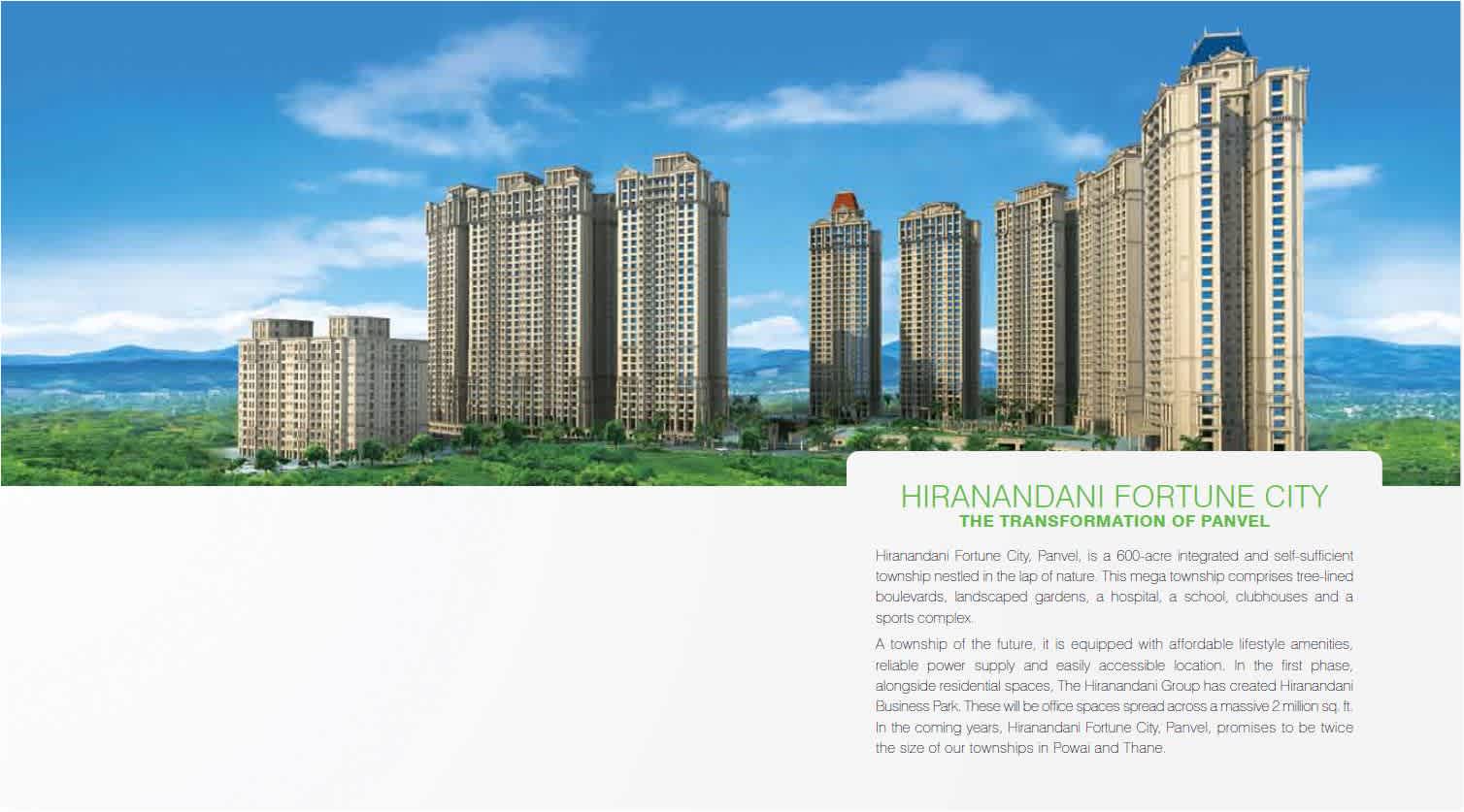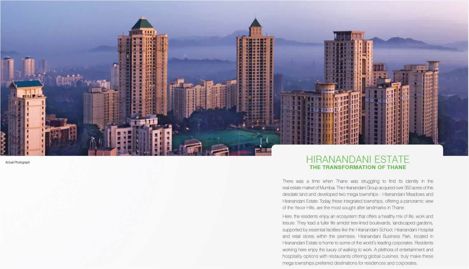 HIRANANDANI ESTATE THE TRANSFORMATION OF THANE There was a time when Thane was struggling to find its identity in the real estate market of Mumbai. The Hiranandani Group acquired over 350 acres of this desolate land and developed two mega townships – Hiranandani Meadows and Hiranandani Estate. Today,these integrated townships, offering a panoramic view of the Yeoor Hills, are the most sought after landmarks in Thane. Here, the residents enjoy an ecosystem that offers a healthy mix of life, work and leisure. They lead a fuller life amidst tree-lined boulevards, landscaped gardens, supported by essential facilities like the Hiranandani School,Hiranandani Hospital and retail stores within the premises. Hiranandani Business Park,located in Hiranandani Estate is home to some of the world’s leading corporates. Residents working here enjoy the luxury of walking to work. A plethora of entertainment and hospitality options with restaurants offering global cuisines,truly make these mega townships preferred destinations for residences and corporates. | |
