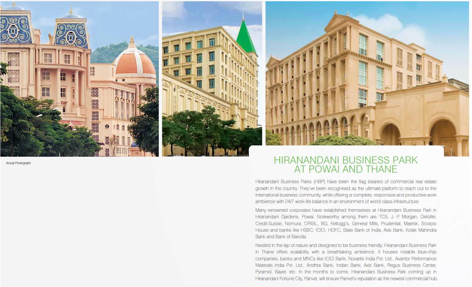 | THE HIRANANDANI WAY WHERE WE GO, CITIES FOLLOW As pioneers of global community townships, The Hiranandani Group continues to transform city landscapes. Decades ago, when Mumbai did not look beyond Bandra and Chembur, we spotted a barren quarry land in Powai and foresaw the potential of creating a well-planned township in its place. We transformed this hillside quarry land into an integrated township of over 250 acres. Today, it is home to a thriving global community, living in harmony with nature. Similarly, we expanded the city’s horizon to Thane by developing around 350 acres of land into a thriving global township with world-class amenities. We take pride in creating townships that bring economic prosperity for residents and businesses alike. Hiranandani Business Parks at our townships are the preferred address of corporates. Today, Hiranandani townships are considered to be the benchmarks of global communities, offering a healthy lifestyle nestled amidst modern luxuries. Actual Photograph | |