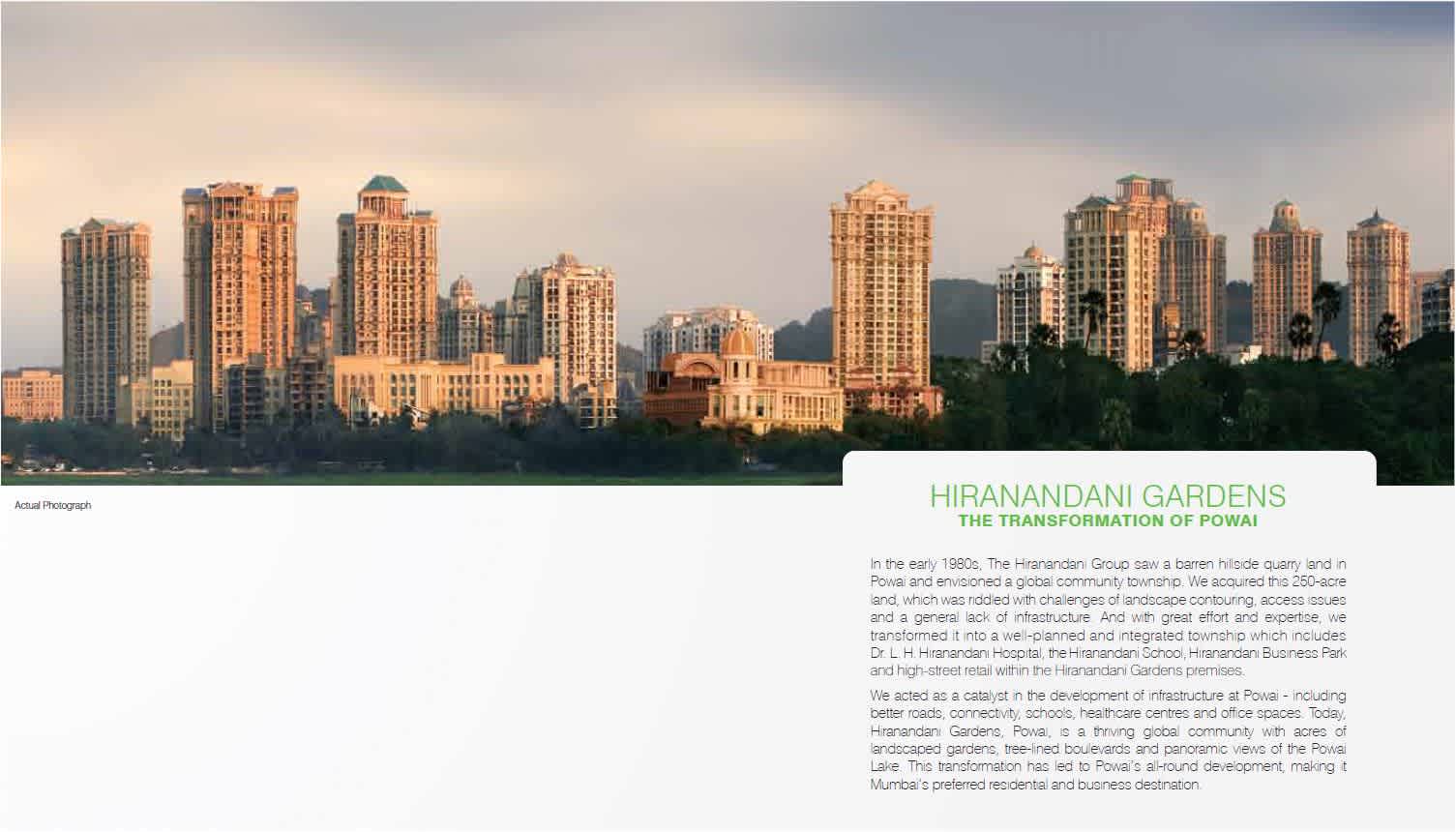 | HIRANANDANI GARDENS THE TRANSFORMATION OF POWAI In the early 1980s, The Hiranandani Group saw a barren hillside quarry land in Powai and envisioned a global community township. We acquired this 250-acre land, which was riddled with challenges of landscape contouring, access issues and a general lack of infrastructure. And with great effort and expertise, we transformed it into a well-planned and integrated township which includes Dr. L. H. Hiranandani Hospital, the Hiranandani School, Hiranandani Business Park and high-street retail within the Hiranandani Gardens premises. We acted as a catalyst in the development of infrastructure at Powai – including better roads, connectivity, schools, healthcare centres and office spaces. Today, Hiranandani Gardens, Powai, is a thriving global community with acres of landscaped gardens, tree-lined boulevards and panoramic views of the Powai Lake. This transformation has led to Powai’s all-round development, making it Mumbai’s preferred residential and business destination. | |