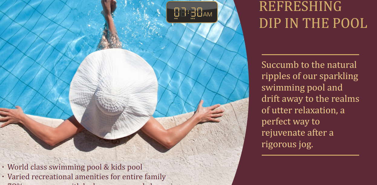 Amenities: 50,000sqft Air-conditioned International standard club house with indoor Swimming pool, Gym, Tennis-court, squash-court, basket ball, snooker, Table tennis, Spa,  restaurant, ATM, Grocery(More Super Market) and  it’s a never ending list . . .