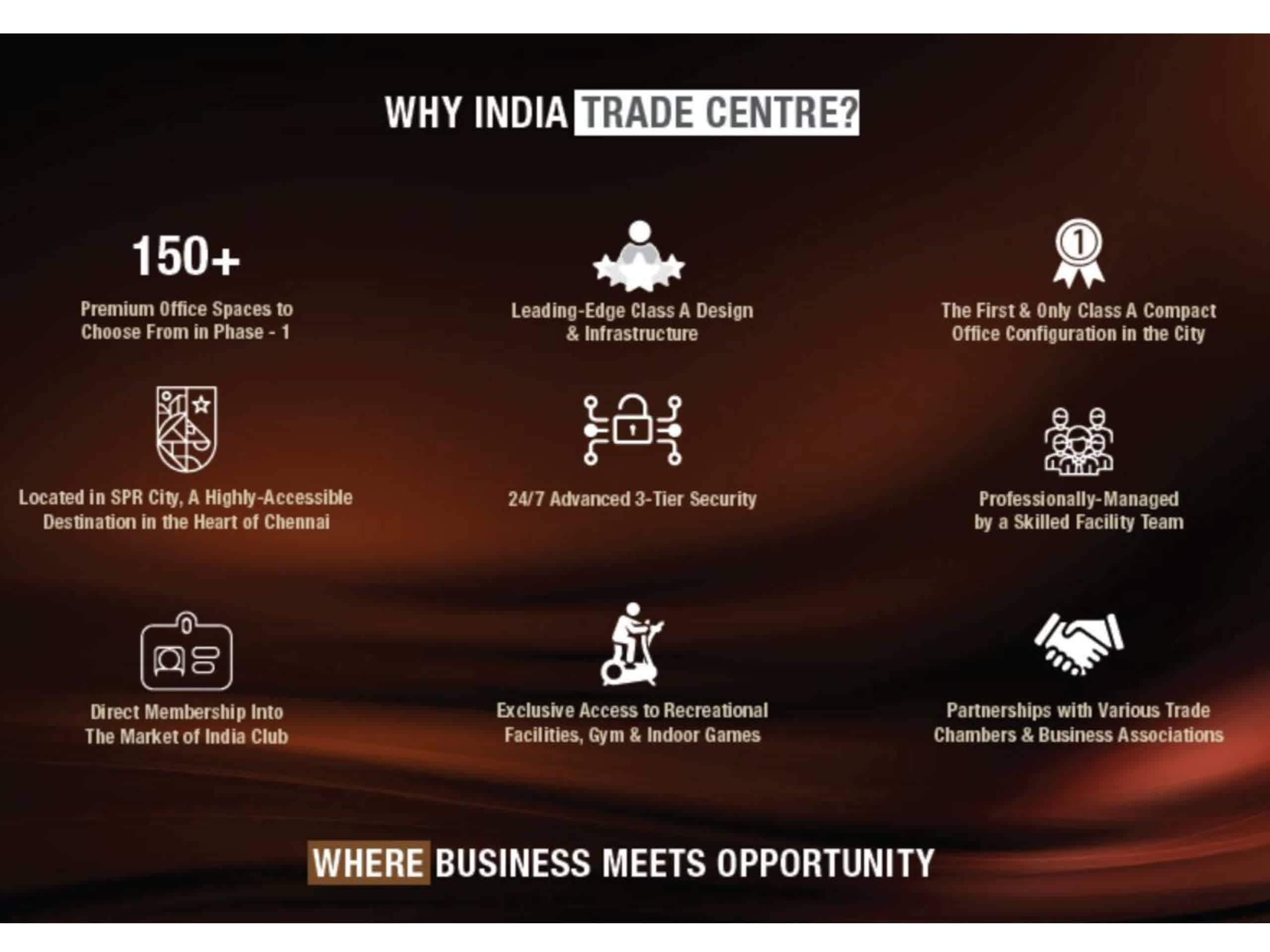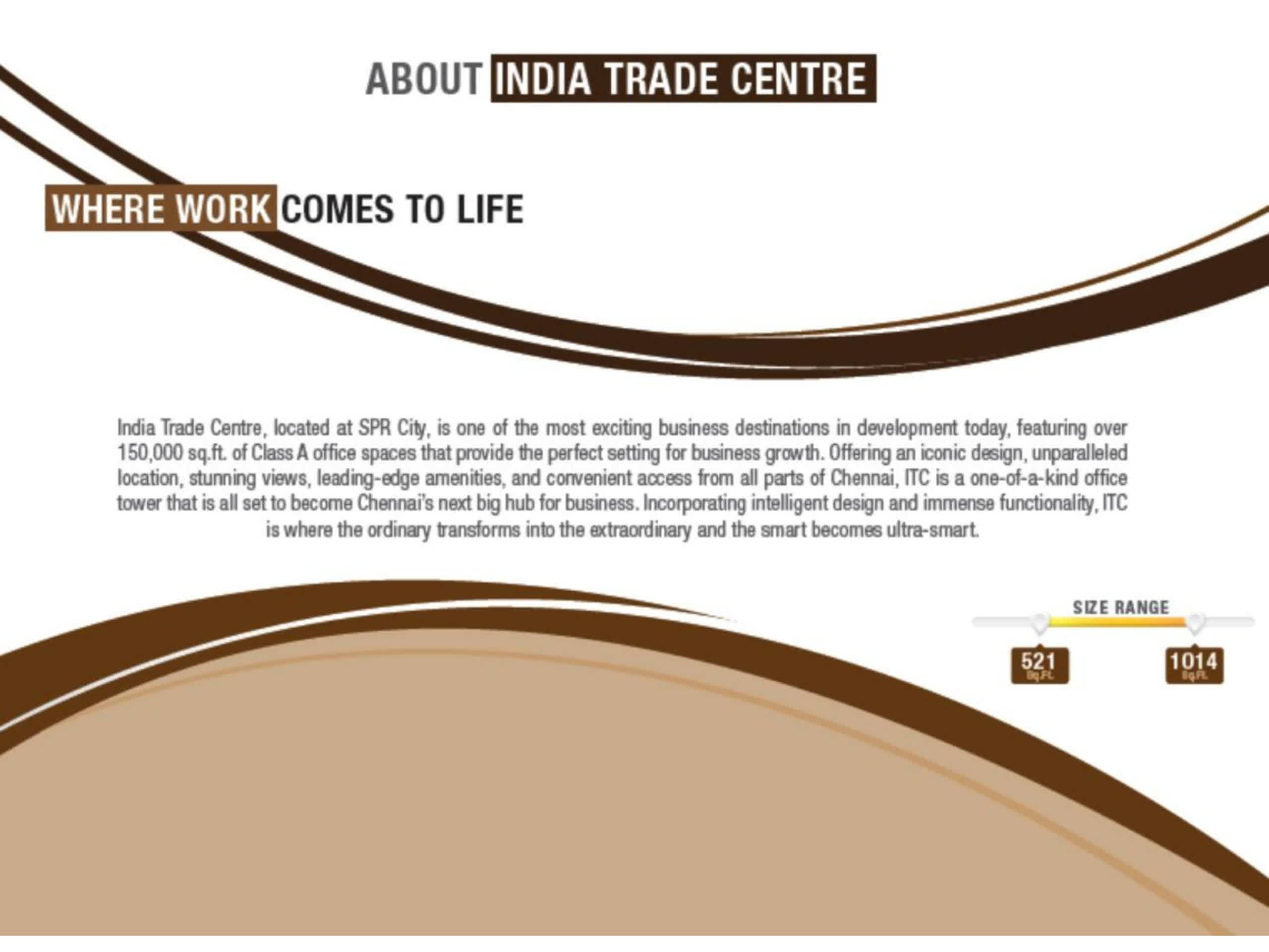 India Trade Centre, located at SPR City, is one of the most exciting business destinations in development today, featuring over 150,000 sq ft of Class A office spaces that provide the prefect setting for business growth. Offering an iconic design, unparalleled location, stunning views, leading edge amenities and convenient access from all parts of Chennai. ITC is one of a kind of kind office tower that is set to become Chennai’s next big hub for business.